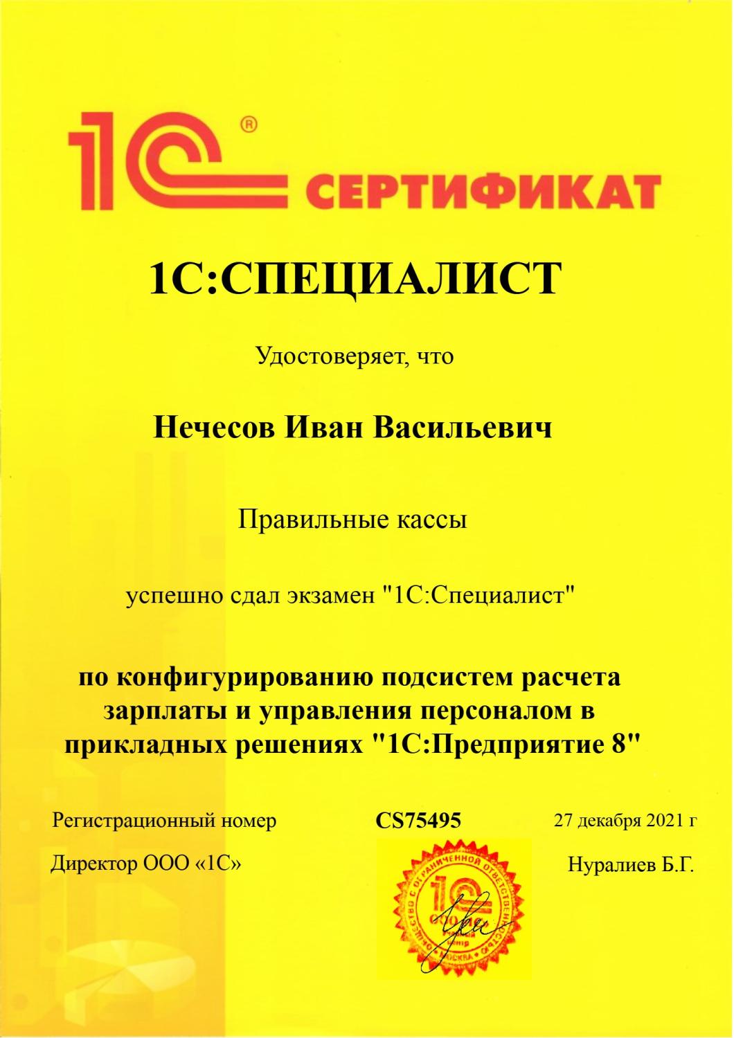 Свидетельство о прохождении курса «Конфигурирование подсистем расчета зарплаты и управления персоналом»